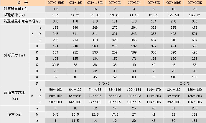 浙江手牌GCT-DK型手推/手鏈單軌小車技術(shù)參數(shù):