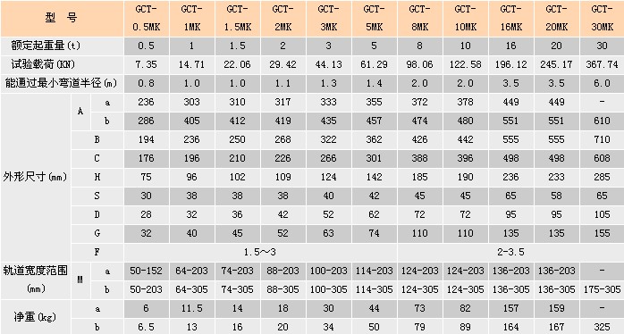 浙江手牌 GCT-MK型手推/手鏈單軌小車技術(shù)參數(shù):