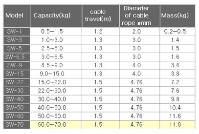 韓國三國SW系列彈簧平衡器技術(shù)參數(shù):