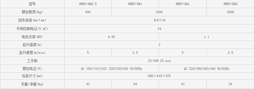 浙江凱勛HHDD-HA0.5-HA1 HHDD-KA1-KA2環(huán)鏈電動葫蘆技術(shù)參數(shù):