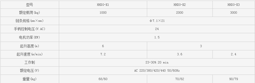 浙江凱勛HHXG-K1--HHXG-K3環(huán)鏈電動葫蘆技術(shù)參數(shù):