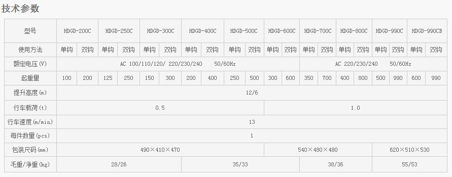 浙江凱勛HDGD-200--HDGD-990電動(dòng)小車(chē)式微型電動(dòng)葫蘆技術(shù)參數(shù):