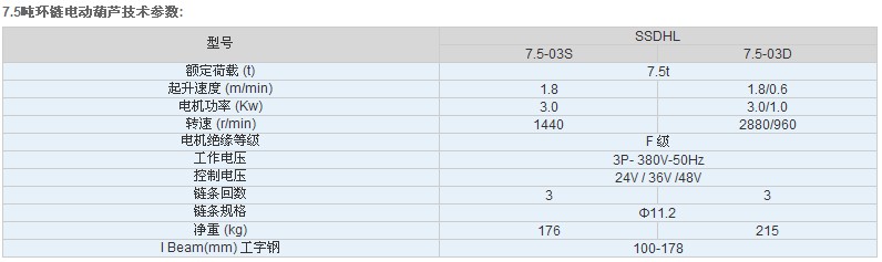 江蘇佳力TXK7.5噸環(huán)鏈電動葫蘆技術參數(shù):