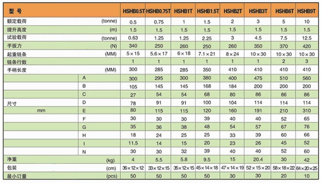 上海滬力HSHB系列手扳葫蘆技術(shù)參數(shù):