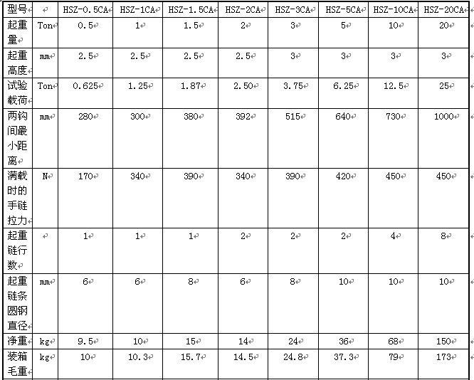 重慶凱榮3噸HSZ-CA型系列手拉葫蘆技術(shù)參數(shù):