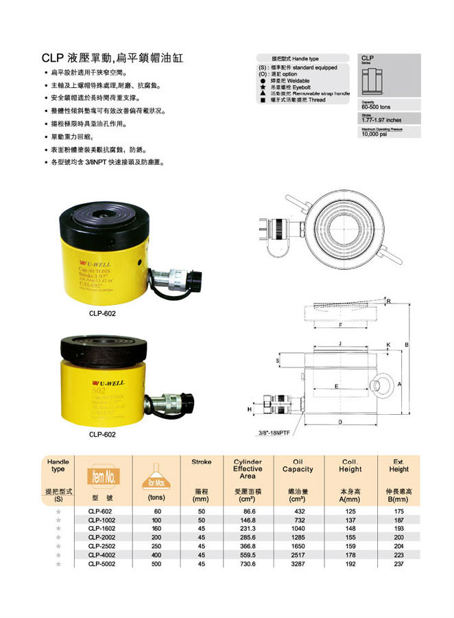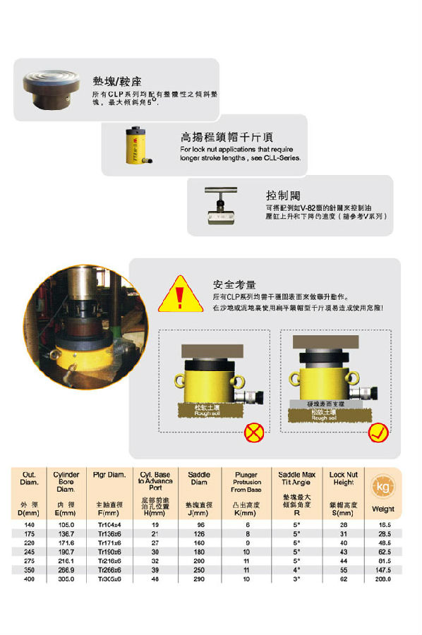 臺(tái)灣優(yōu)偉CLP液壓?jiǎn)蝿?dòng)式扁平鎖帽油缸扁平的設(shè)計(jì)理念,使其能夠勝任狹窄的空間,在狹窄的環(huán)境下也能夠正常的作業(yè)。產(chǎn)品的回縮形式為單動(dòng)重力回縮;整體性?xún)A斜墊塊有效的改善了偏荷載的狀況;其安全鎖帽的設(shè)計(jì),使產(chǎn)品能夠進(jìn)行長(zhǎng)時(shí)間的荷載支撐作業(yè);主軸與螺帽經(jīng)過(guò)特殊的處理,增強(qiáng)了其耐磨性與抗腐蝕性,延長(zhǎng)了產(chǎn)品的使用壽命。所有CLP系列均需穩(wěn)定表面來(lái)做舉升動(dòng)作,在沙地或泥地使用扁平鎖帽型油缸易造成使用危險(xiǎn)。